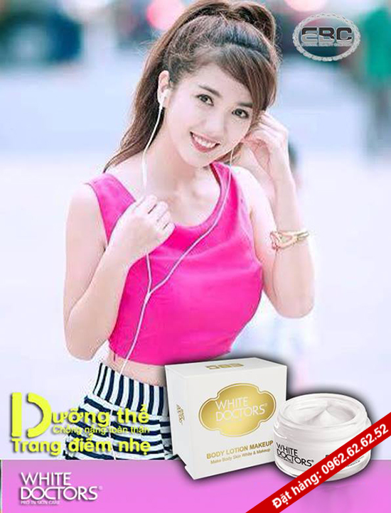 • Bước 3: Dưỡng trắng da toàn thân ban ngày bằng kem Body Lotion Makeup – White Doctors giúp bạn có ngay làn da trắng sáng tức thì, chống nắng bảo vệ da ( kem thấm người khác thấy bạn cực trắng nhưng không biết là dùng kem).